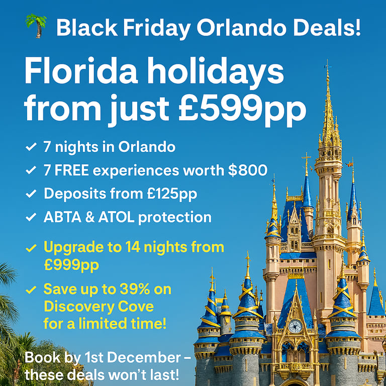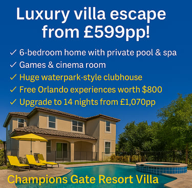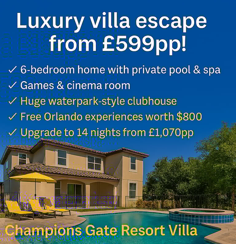 •7 Nights•Stunning 6-bedroom home with private pool & spa, themed bedrooms, games and cinema room•Luxury gated villa resort with a huge waterpark-style clubhouse and easy access to Walt Disney World Resort•FREE Orlando attractions worth up to $800 per family of 4*•14 Nights from £1,070pp•Please quote: DOC4515