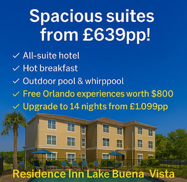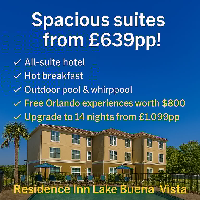 •7 Nights•Spacious all-suite hotel with complimentary hot breakfast near Walt Disney World Resort•Relaxed resort-style facilities including outdoor pool, whirlpool and sports court, close to shops and dining•FREE Orlando attractions worth up to $800 per family of 4*•14 Nights from £1,099pp•Please quote: DOC4512