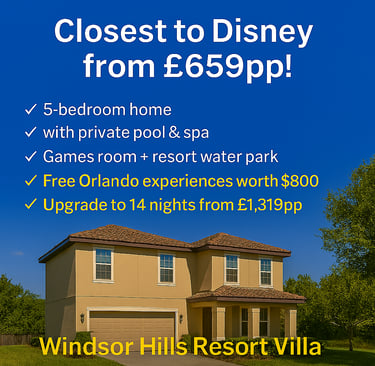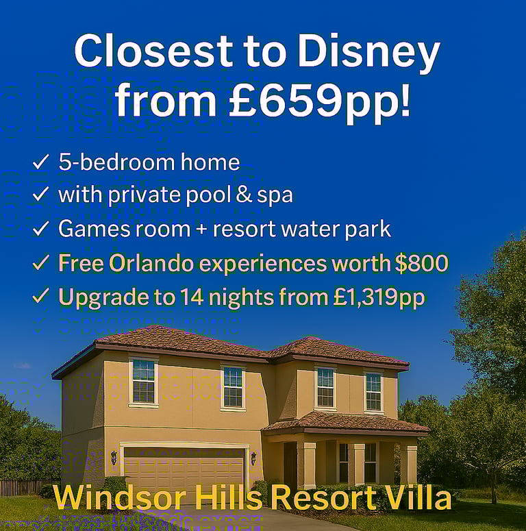 •7 Nights•Welcoming 5-bedroom home with private pool & spa and games room•Closest villa community to Walt Disney World Resort, with a huge resort pool and on-site water park•FREE Orlando attractions worth up to $800 per family of 4*•14 Nights from £1,319pp•Please quote: DOC4518
